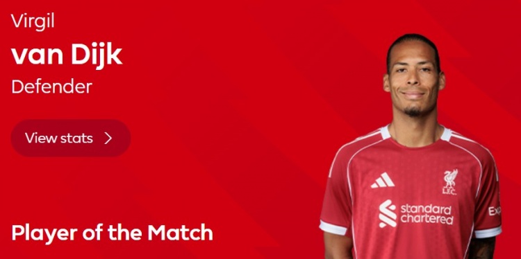 本场比赛范戴克在伤停补时阶段打进绝杀,此外还有7次解围,赛后当选英超官方球迷票选全场最佳球员。